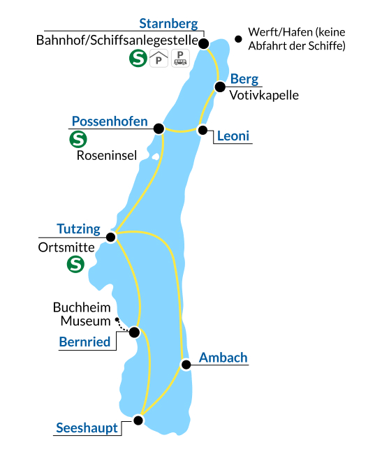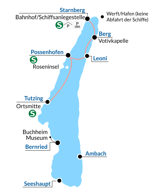 Ab Starnberg geht es mit dem Schiff nach Tutzing. Ein Wanderweg über Garatshausen durch den Feldafinger Park führt nach ca. 1,5 Stunden nach Possenhofen. Im Schlosspark lockt ein großes Erholungsgelände mit schönem Spielplatz. Das Schloss selbst ist leider nicht zu besichtigen. Vom Dampfersteg in Possenhofen geht es per Schiff zurück nach Starnberg.