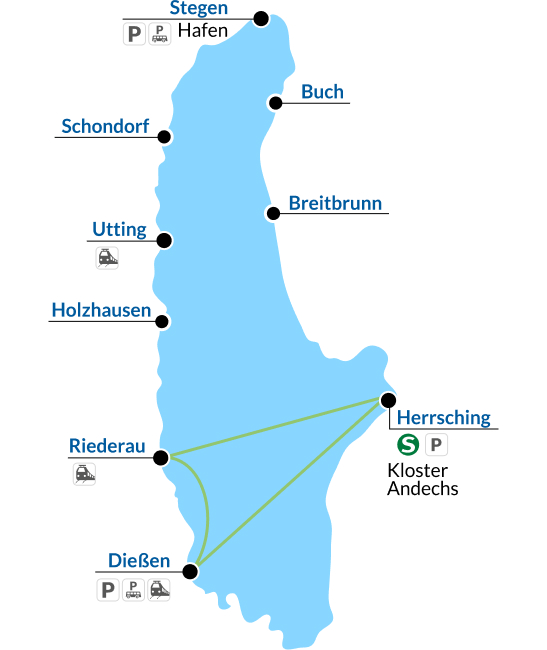 After docking in Schondorf, you can visit the 12th-century Romanesque pilgrimage church of St. Jakob. Right next door, the cozy “Seepost” beer garden awaits you. If you still need some exercise, hike for about 30 minutes towards Stegen and refresh yourself at the bathing beach in Eching. After another 30 minutes of walking, you will reach Stegen. From there, take the boat back to your starting point.