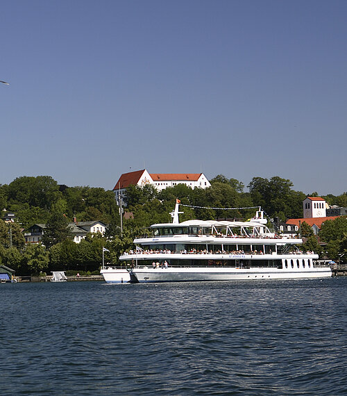 The chapel dedicated to the fairy-tale king Ludwig II stands in the park of Berg Castle. Take a break from your tour in Berg and walk to the chapel in about 20 minutes. Continue at a leisurely pace through the park to Leoni, where you can continue your journey on the next boat. A short excursion – and a particularly atmospheric moment on Lake Starnberg.