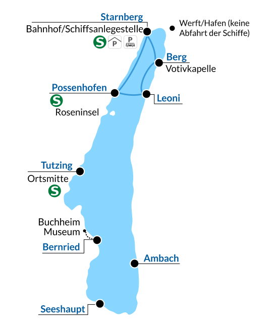 From Starnberg, take the boat to Tutzing. A hiking trail via Garatshausen through Feldafinger Park leads to Possenhofen in about 1.5 hours. The Castle Park features a large recreation area with a beautiful playground. Unfortunately, the castle itself is not open to visitors. From the steamboat pier in Possenhofen, take the boat back to Starnberg.